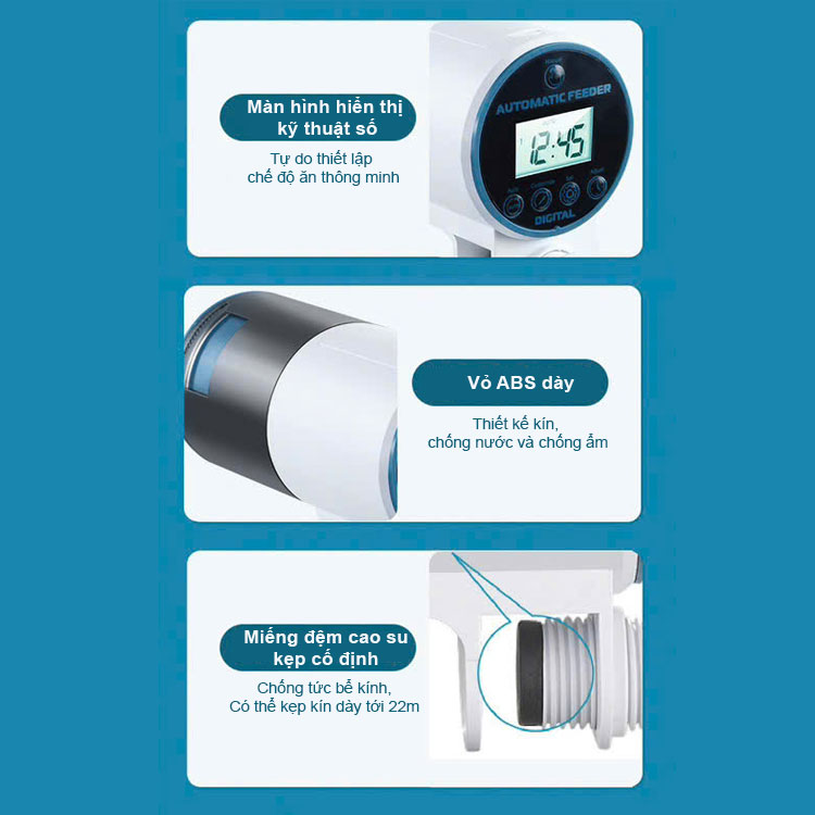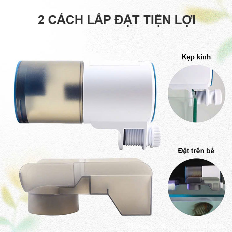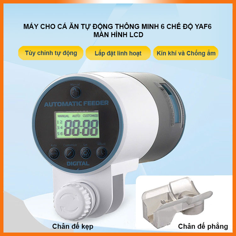 Dụng cụ cho cá ăn là một chiếc máy tiện lợi không thể thiếu mỗi khi bạn vắng nhà hay bận công việc, đi công tác hoặc đi chơi dài ngày. Với chế độ hẹn giờ 6 lần trong ngày cho cá ăn. bạn cũng có thể điều chỉnh mức độ thức ăn theo ý mình. Thức ăn thích hợp với máy là dạng viên hoặc mảnh.