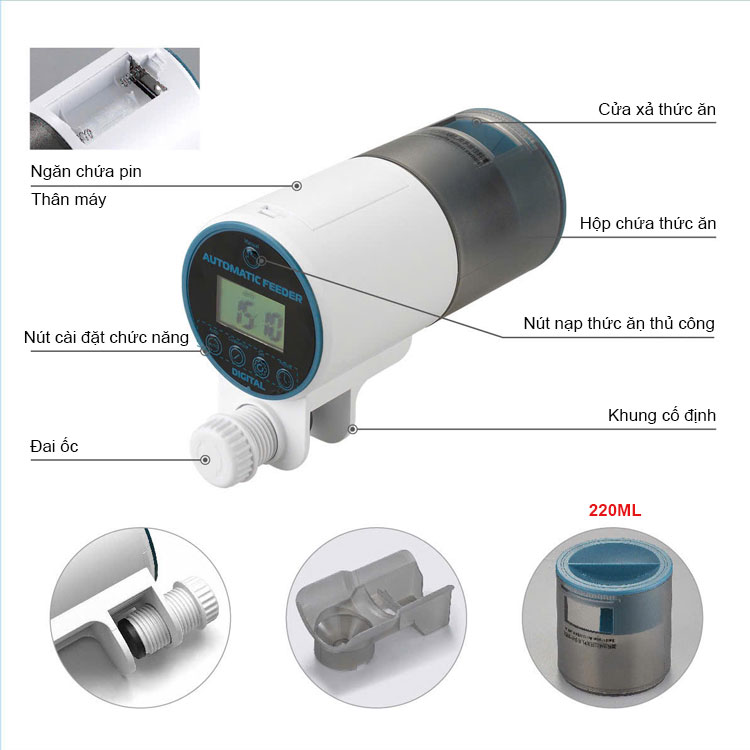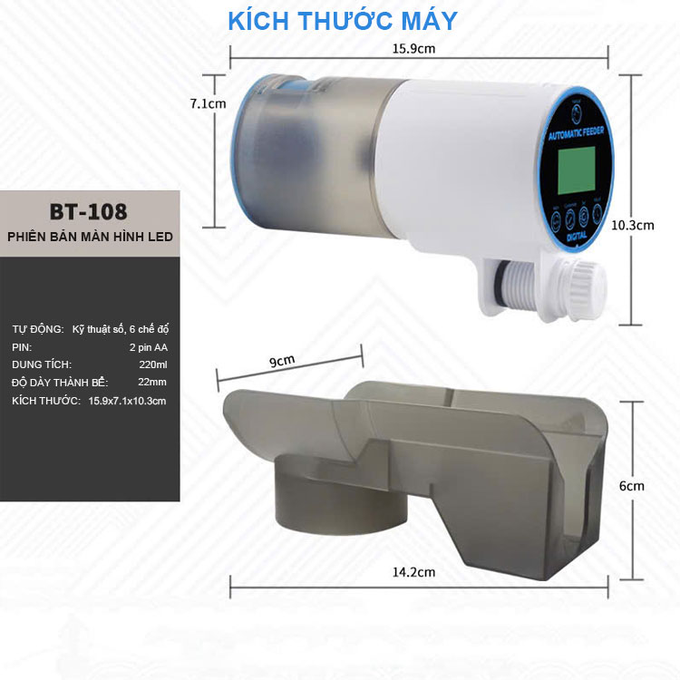 Chất liệu: Nhựa. Màu sắc: Màu trắng, xanh dương. Nguồn điện: 2 Pin AA Cho cá ăn tối đa 6 lần trong ngày Dễ dàng làm sạch, dễ dàng cho thức ăn vào hộp, dung tich thùng 260ml, 130ml. Điều chỉnh được khối lượng thực phẩm và thời gian cho ăn. Thức ăn phù hợp với mảnh hoặc bột viên, đồ khô, dạng dài, dạng miếng to. Kích thước : 15.9x7.1x10.3 cm