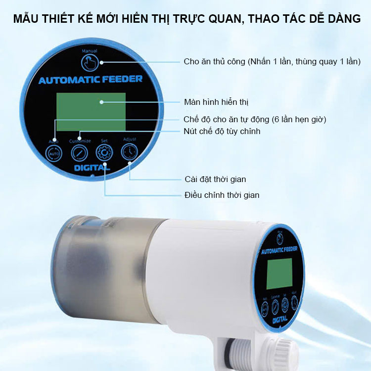 – Đặt thời gian bằng cách chỉnh giờ hiện tại trước, sau đó tùy chỉnh số lần cho ăn từ 1.2.3.4.5.6 là mốc thời gian để cho cá ăn, sau đó nhấn nút SET để cài giờ và phút, tiếp đến nhấn ADJUST để chỉnh giờ và phút.