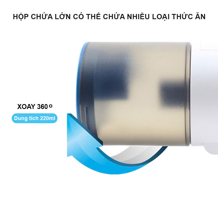 + Thân Máy, Đế (đế kẹp, đế phẳng), Hộp chứa thức ăn ( hộp 220ml), phễu cho thức ăn, 2 Pin AA.